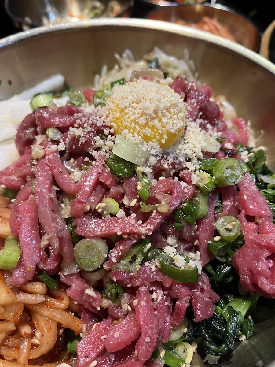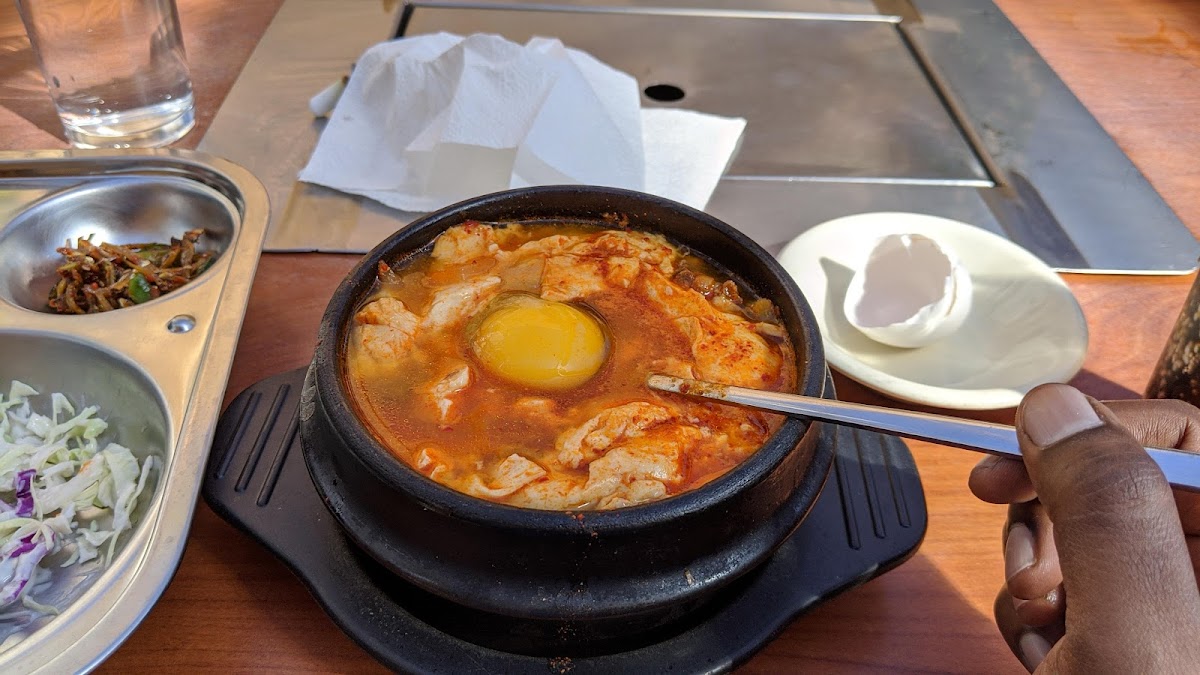 Have been wanting to try charcoal grill, and this was a good first experience! We (party of 2) went early during Mother's Day, and although it was crowded, we were seated relatively quickly, the food came out fast, and the servers were attentive at changing the grill, clearing dishes, refilling waters etc. We ordered the spicy pork, kalbi short ribs, and soondubu / spicy tofu soup in medium. The meat was tender, marinated well, and tasted high-quality, which I expected given the prices. My favorite was the spicy tofu soup, it was the perfect level of spice and was a comforting dish on a cold day. It was also nice to sip on in between breaks from the meat. The hot tea was also delicious and refreshing. Not sure if this is because of the holiday, but they also gave us a complimentary japchae w/ beef that was really good! Overall, with the rice & banchan (which was tasty!), we left full and even brought a little home. I would have to try more charcoal grill BBQ places, but this was a solid dinner spot!